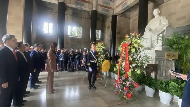 鄭麗文上午在南京中山陵向國父孫中山陵寢獻花圈致敬,並向靈柩行三鞠躬禮、默哀,之後進入墓室繞墓壙一周。