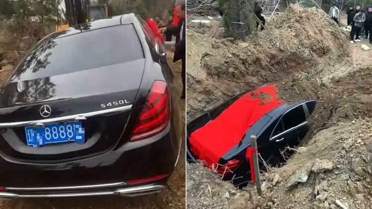 據中國《新黃河》等媒體報導,這場豪車陪葬儀式在4月9日進行,車主僱來一輛挖掘機充當吊車,把賓士S450L吊入已經挖好的墓坑裡,然後再覆土掩埋,作為先人的陪葬品。