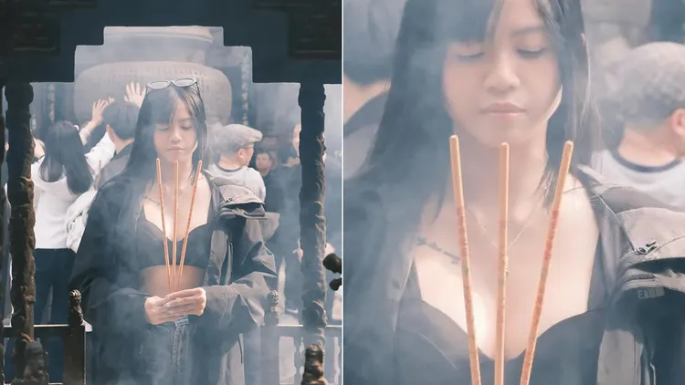 據馬來西亞《中國報》報導,Junee近日疑似是到中國旅遊,上香地點推測是洛陽白馬寺,她在threads分享的照片顯示,她上香時拉開外套拉鏈,露出貼身上衣,在香爐前秀出乳溝與肚臍。