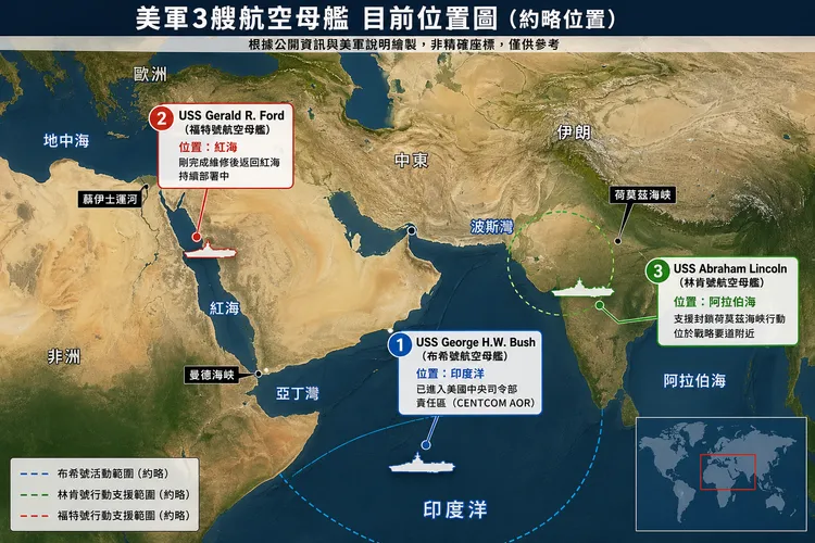 美國中央司令部週四宣布,「布希號」已抵達印度洋。這艘航母3月底從維吉尼亞州出發,繞行非洲海岸前往該區域。與此同時,「福特號」在克羅埃西亞完成維修後,已返回紅海,繼續執行這趟破紀錄的部署任務。