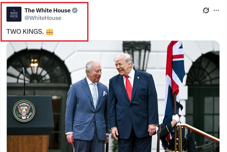 中央社報導,英國國王查爾斯三世赴美進行國是訪問,白宮今天在川普與查爾斯三世的合照圖說寫下「兩位國王」,引發外界討論。
