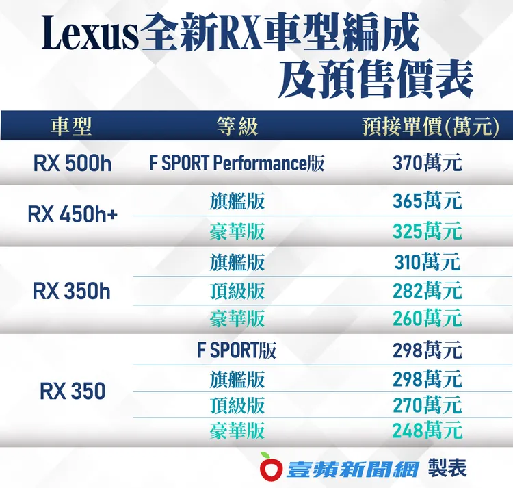Lexus全新RX這次大改款導入多項先進科技,並導入三款Electrified電動化動力系統,其中更包含RX歷代以來最強動力的500h車型,其搭載全新開發的2.4升渦輪油電複合動力與DIRECT 4電子式四輪傳動系統,可輸出367匹綜效馬力、56.1kgm最大扭力的表現,國外數據可在5.9秒完成0~100km/h加速,而除了RX 500h,這次RX車系也同樣首度導入450h+插電式油電複合動力,並搭配350h油電複合動力建構三款Electrified電動化動力陣容,而RX 350則是採2.4升渦輪引擎,也是唯一的純汽油動力。