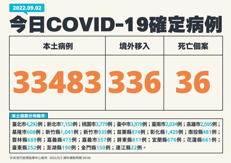 針對今增確診,指揮中心表示,今日新增33,483例本土病例,為15,162例男性、18,303例女性、18例調查中,年齡介於未滿5歲至90多歲以上,個案分布為新北市(7,153例),臺北市(4,292例),臺中市(3,979例),桃園市(3,779例),高雄市(2,595例),臺南市(2,034例),彰化縣(1,429例),新竹縣(1,041例),新竹市(935例),苗栗縣(874例),屏東縣(811例),雲林縣(689例),宜蘭縣(676例),花蓮縣(661例),基隆市(608例),南投縣(481例),嘉義縣(475例),嘉義市(357例),臺東縣(252例),澎湖縣(190例),金門縣(150例),連江縣(22例)。