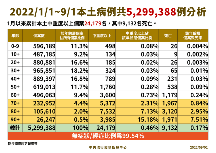 此外,羅一鈞說,今年1/1~9/1累計將近530萬例本土病例,輕症和無症狀比例仍佔99.5%,而這1、2周BA.5本土疫情剛升溫,輕症和無症狀比例看來沒有明顯變化;至於致死率,各年齡層都沒明顯變化,全年齡致死率跟上周一樣維持0.17%,略從上週0.174%下降,主要在70、80、90歲等3個年齡層分別略降0.02~0.03%,這算是誤差範圍,沒有因為這一波BA.5本土流行造成致死率升高,將再持續觀察。