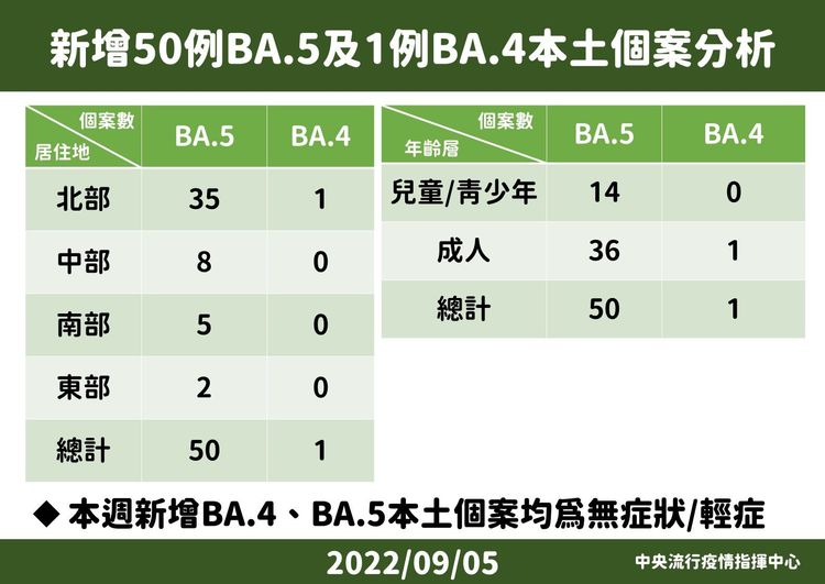 指揮中心指出,今日新增之Omicron亞型變異株本土個案,為50例 BA.5及1例BA.4。其中BA.5個案占上週所有已定序之132例的37.9%,為24名男性、26名女性,年齡介於未滿5歲至90多歲,分布為北部35例、中部8例、南部5例、東部2例,確診日介於今(2022)年8月15日至8月26日。另1例BA.4本土個案為北部40多歲男性,於8月23日確診,為本土首例重複感染之 BA.4個案。