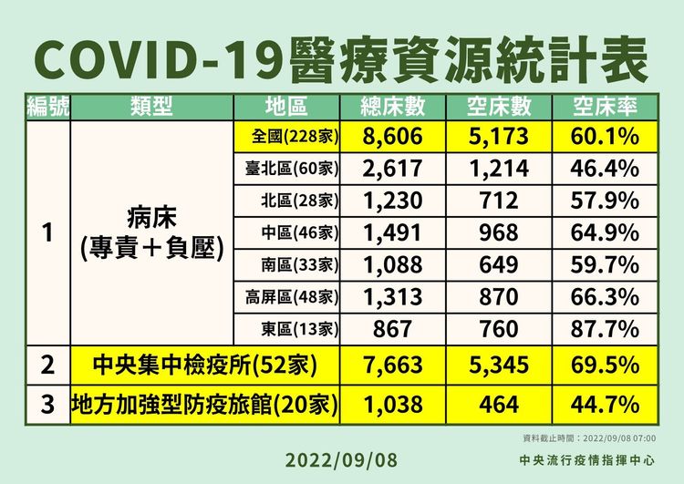 此外,羅一鈞說,目前全國各區專責病房空床率超過60%,各區空床率平均在45%以上,因此醫藥應變組會議昨(9/7)檢視各區收治和占床情形,決議本周暫時不調整床數,各醫院請按照8/31指揮中心發函要求的開率比例去開設,未來持續根據每周情況去滾動調整。
