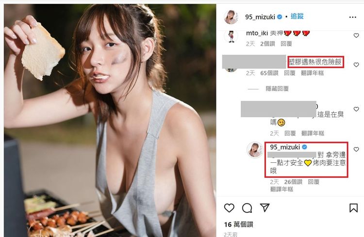有酸民留言「塑膠遇熱很危險餒」,林襄親回「對 拿旁邊一點才安全💛烤肉要注意哦」;但粉絲為她出氣大罵「沒水準」、「這是在臭嗎」,還反酸「是啊 你身上很多都塑膠 也要遠離熱源喔」、「怎麼會有這麼沒知識的人啊 矽膠就矽膠還在那邊塑膠…酸人還犯蠢 人家天然的你講話跟空氣一樣透明」。