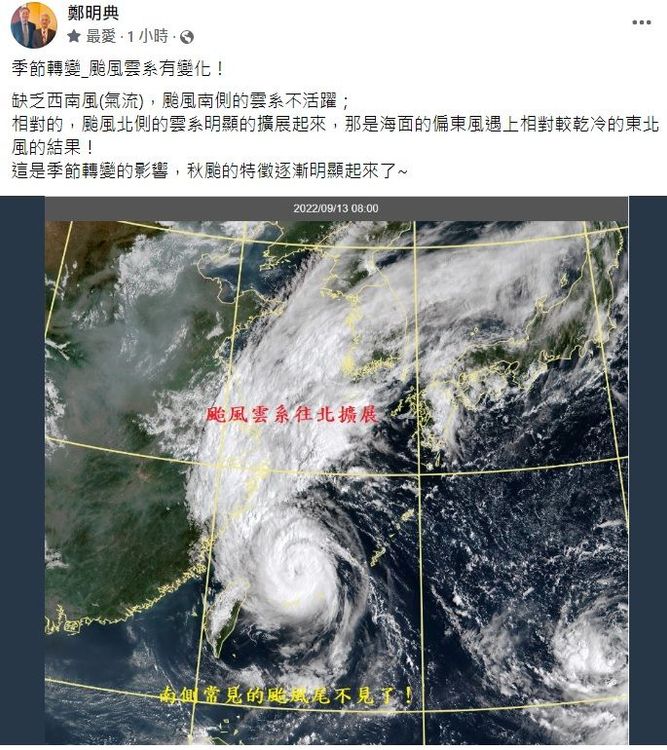 氣象局局長鄭明典今在臉書發文,「季節轉變,颱風雲系有變化!」,他貼出雲圖表示,因缺乏西南風(氣流),颱風南側的雲系不活躍,「南側常見的颱風尾不見了」。