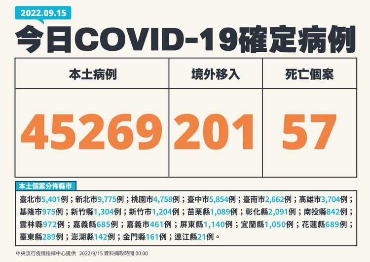 針對今增確診,指揮中心表示,今日新增45,269例本土病例,為20,378例男性、24,886例女性、5例調查中;年齡介於未滿5歲至90多歲以上;個案分布為新北市(9,775例),臺中市(5,854例),臺北市(5,401例),桃園市(4,758例),高雄市(3,704例),臺南市(2,662例),彰化縣(2,091例),新竹縣(1,304例),新竹市(1,204例),屏東縣(1,140例),苗栗縣(1,089例),宜蘭縣(1,050例),基隆市(975例),雲林縣(972例),南投縣(842例),花蓮縣(689例),嘉義縣(685例),嘉義市(461例),臺東縣(289例),金門縣(161例),澎湖縣(142例),連江縣(21例)。