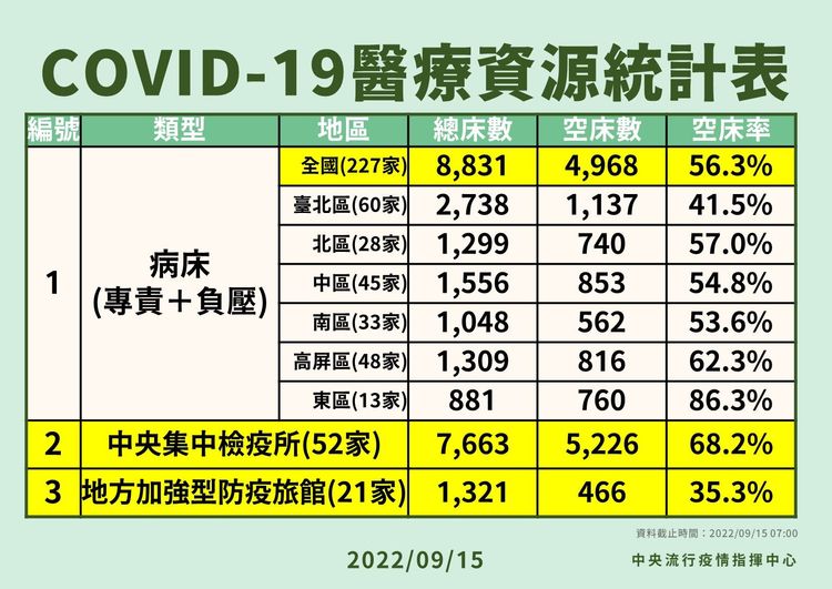 針對全國專責和負壓隔離病床數和空床率,羅一鈞說明,本周各縣市確診數均增加,指揮中心已於前2周通知全國醫療院所加開專責病床,目前全國專責病床共計8831床,空床率56%,其中台北區空床率41.5%較2低,不過,指揮中心醫療應變組昨(9/14)開會,評估各區回報占床率和開設專責病床數都算足夠,所以本周沒有額外增開專責病床,會維持目前增開情形。