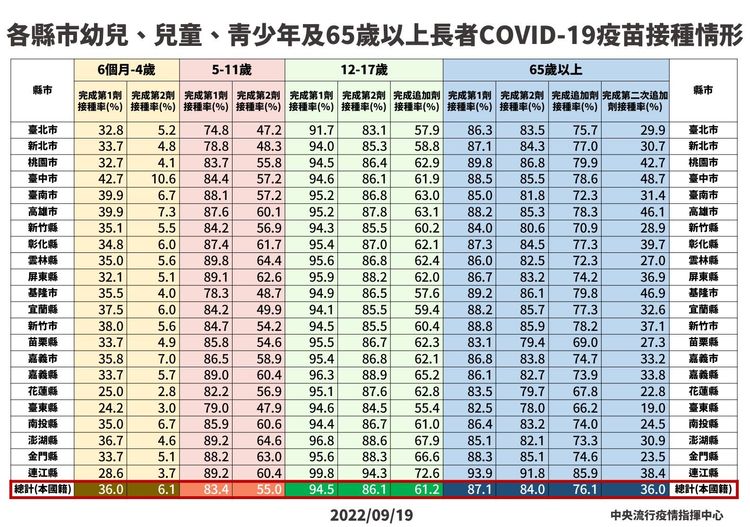 9 月 17 日至 111 年 9 月 18 日 COVID-19 疫苗接種 32,806 人次, 疫苗接種人口涵蓋率第一劑 93.4%、第二劑87.3%、基礎加強劑接種率 0.8%、追加劑接種率 72.9%(若以符合追加劑接種間隔人數統計約 93.3%),第二次追加劑接種率 10.2% (65 歲以上接種率 36%)。