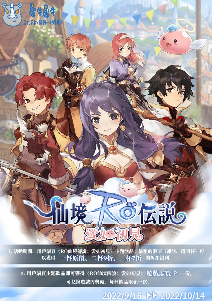 活動四:香港專屬-《RO仙境傳說:愛如初見》X 犀牛犀牛 聯名飲品重磅推出 9/15-10/14 活動期間,官方與香港知名茶飲店「犀牛犀牛」推出聯名產品「最粗的港棟」!身處香港的冒險者們,只要前往「犀牛犀牛」購買聯名產品,即可贈送虛寶卡一張喔!另外要跟朋友一起購買,還可以享有特別折扣-兩杯9折、三杯7折,邊喝邊冒險,喝越多省越多!