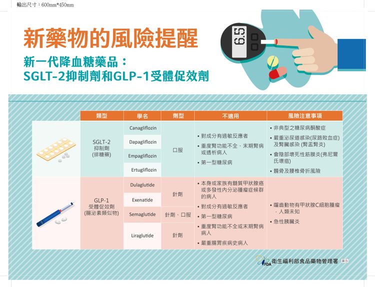 中華民國糖尿病衛教學會理事長王治元說明,SGLT2排糖藥或GLP-1糖瘦針雖可降血糖,還能降低心臟動脈硬化和心臟衰竭發生率,並控制體重,但還是有風險,其中SGLT2可能造成生殖器和泌尿道感染、骨折和酮酸中毒風險,若出現頭暈、噁心、嘔吐、腹痛及異常疲倦、全身痠痛、嗜睡或昏迷等症狀,應儘速就醫檢查。
