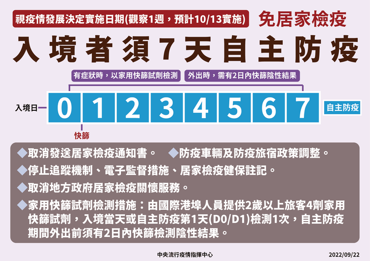 一、檢疫天數:免居家檢疫,須7天自主防疫。