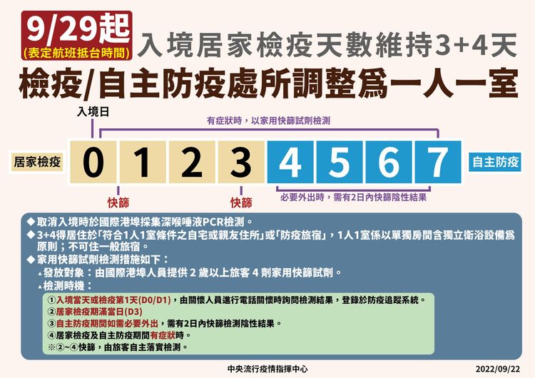 Q2:入境檢疫3+4改為全程1人1室後,可以住一般旅館嗎? A:不可以,3+4期間都得於「符合1人1室條件的自宅或親友住所」或「防疫旅宿」,1人1室以單獨房間含獨立衛浴設備為原則。