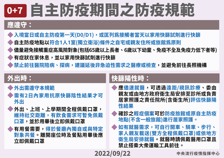 Q4:0+7期間,外出須遵守什麼條件? A:入境當天或第1天檢測1次,自主防疫期間外出前需有2日內快篩檢測陰性結果。