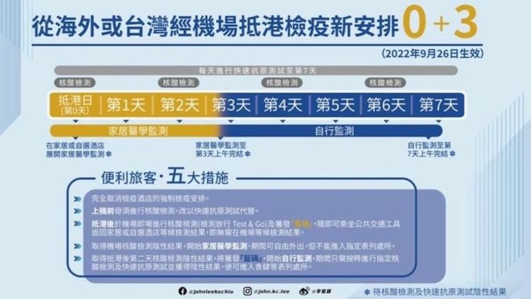 香港近期將實施入境0+3措施,對此醫療應變組副組長羅一鈞說明,香港衛生署上週公佈0+3,但前3天後,還有4天類似自主防疫的過程,且旅客天天要快篩,總共7天的過程中還有4次PCR,是比台灣即將施行的「0+7」更嚴格的做法,目前沒有跟進的打算。