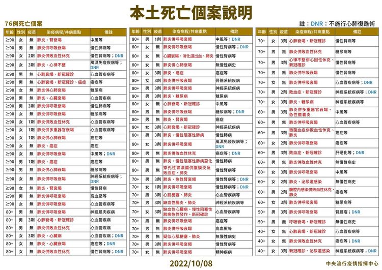 對於死亡個案,指揮中心指出,今日新增76例本土病例死亡個案,為39例男性、37例女性,年齡介於40多歲至90多歲以上,皆屬重度感染、71例具慢性病史、50例未接種3劑以上COVID-19疫苗。確診日介於今年8月29日至10月5日,死亡日期介於9月17日至10月5日。