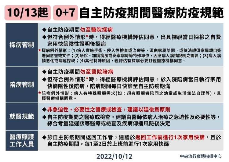 醫療應變組副組長羅一鈞指出,自主防疫期間,應避免醫院探病陪病,但有數種例外,探病例外情形包括病人實施手術、侵入性檢查或治療等,須由家屬陪同或依法規須家屬親自簽署同意書或文件;急診、加護病房或安寧病房等特殊單位,因應病人病情說明需要,病人病情惡化或病危探視,以及其他無法涵蓋到的特殊原因,需經醫療機構同意。