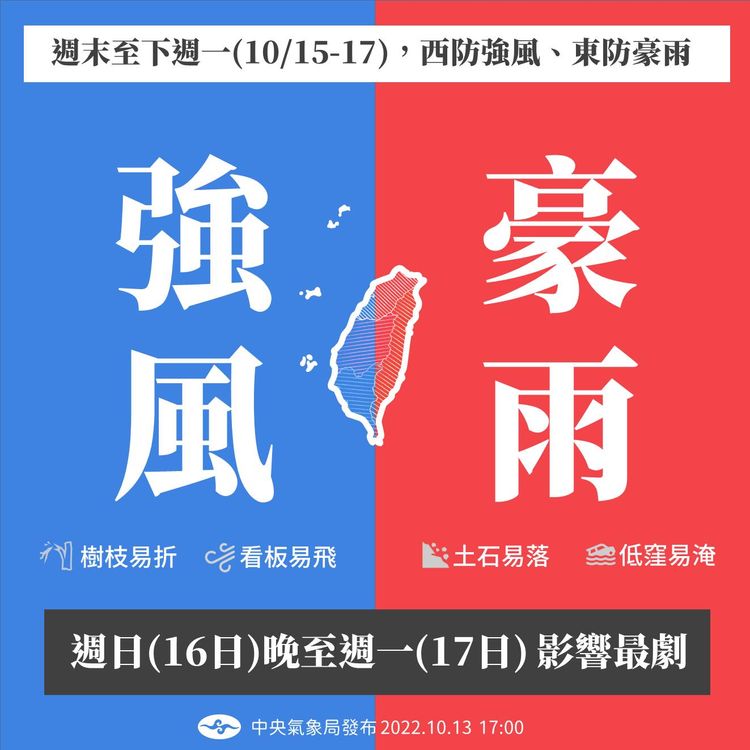 氣象局發布陸上強風特報,東北風明顯偏強,桃園至嘉義、東南部(含蘭嶼、綠島)、恆春半島沿海空曠地區及澎湖、金門、馬祖將有9至10級強陣風,基隆北海岸及東北部、東部沿海空曠地區亦有較強陣風,鄰近海域並有較大風浪。