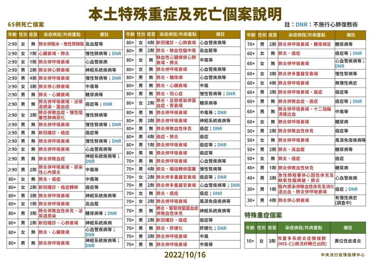 指揮中心表示,今有兩例30多歲死亡個案,其中一位接種4劑疫苗,有肺炎併心肺衰竭,有慢性病史,但細節仍在調查中,另一位曾接種一劑疫苗,為護理之家住民,有癌症病史,爲腹內感染並敗血性休克及消化道出血、肺炎併呼吸衰竭個案。