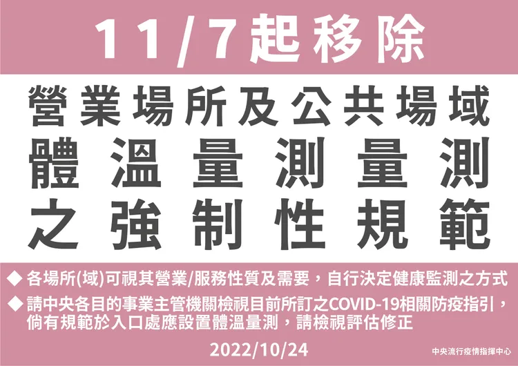 他表示,且不要求營業場所與公共場域進行體溫量測,因為新冠肺炎疾病本身用體溫量測效用不大,造成人力上的損耗,把他從強制規範移除,各場所依照需要決定是否繼續量測體溫,醫院、住宿式長照機構可以考量,請各目的指引機關規範與修正。