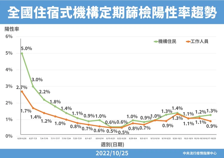 對於長照機構陽性率,醫療應變組副組長羅一鈞則說,工作人員陽性率自1.1%降至上周0.9%,住民則從1.2%提升至1.3%,但預期下周也會下降;此外,機構定期快篩將持續進行至11月底,上周中重症、送醫情況與前幾周相近,整體投藥率為93%,且確診當天就能投藥,60歲以上致死率與前一波相比則有明顯下降,可能與機構篩檢、快速給藥有關。