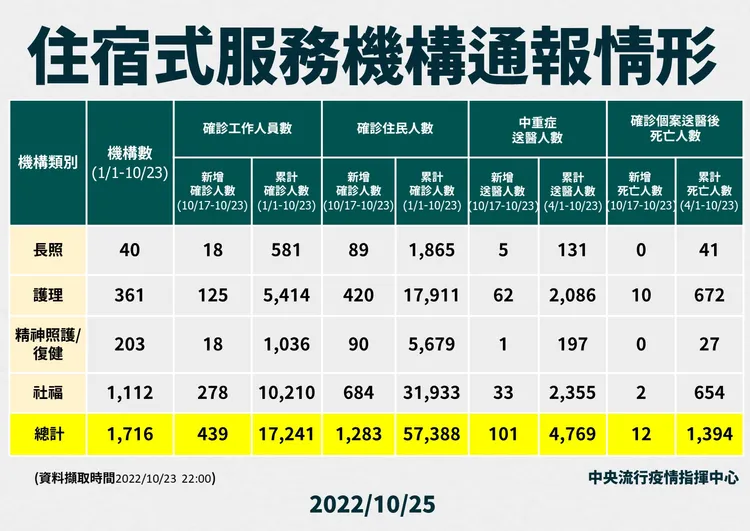 對於死亡個案,指揮中心指出,今日新增42例本土病例死亡個案,為21例男性、21例女性,年齡介於50多歲至90多歲以上,皆屬重度感染、39例具慢性病史、33例未接種3劑以上COVID-19疫苗。確診日介於今(2022)年5月16日至10月22日,死亡日期介於6月6日至10月22日,詳如新聞稿附件。