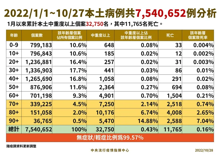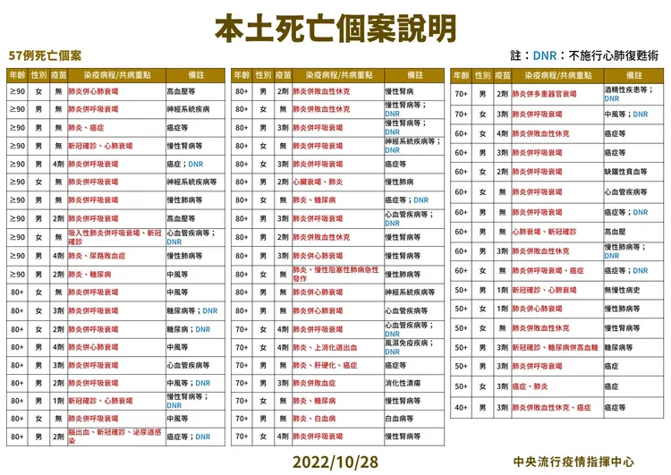 對於死亡個案,指揮中心指出,今日新增57例本土病例死亡個案,為33例男性、24例女性,年齡介於40多歲至90多歲以上,皆屬重度感染、56例具慢性病史、36例未接種3劑以上COVID-19疫苗。確診日介於今年9月2日至10月25日,死亡日期介於9月12日至10月25日。