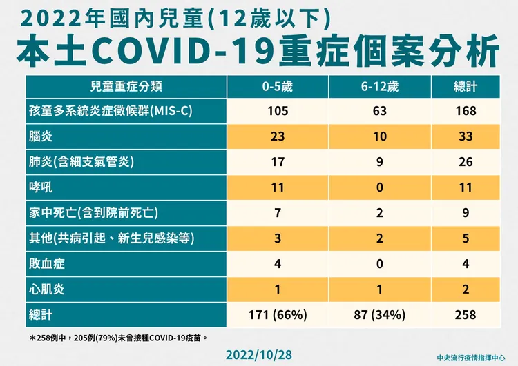 針對新增死亡病例,醫療應變組副組長羅一鈞說,患者是一名40多歲男,打過3劑新冠疫苗,有癌症轉移病史,規則接受化療,10/6因化療而住院,入院PCR篩檢陽性確診,收治隔離病房,住院期間因癌症病情惡化、敗血性休克,於10/23過世,死因為新冠病毒感染合併敗血性休克、呼吸衰竭、癌症。