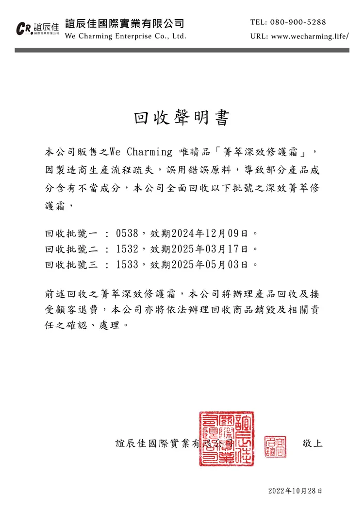 本次共有三個批號修護霜須回收,分別為「批號0538,效期2024年12月9」、「批號1532,效期2025年3月17日」、「批號1533,效期2025年5月3日」。廠商強調將依法辦理回收產品銷毀及接受消費者退費。