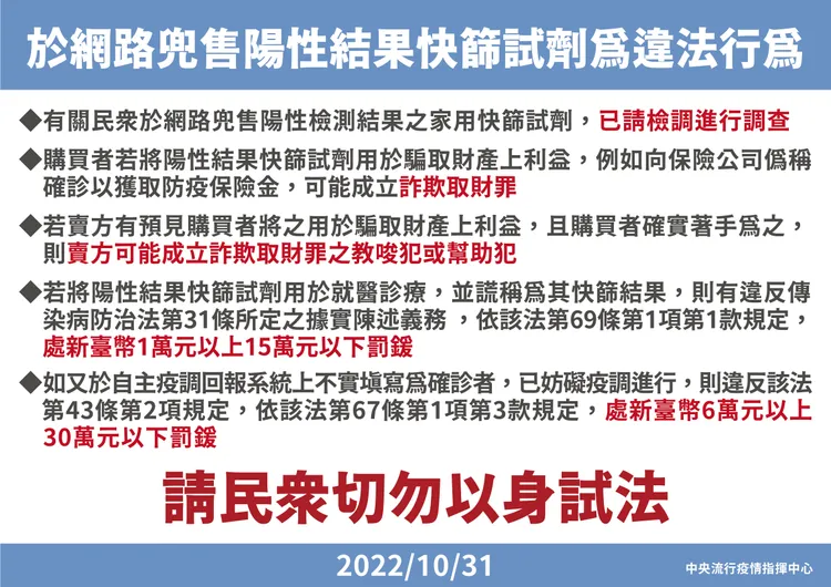 此外,若購買者將陽性快篩用於就醫診療,莊人祥表示,因為謊稱快篩陽性,將違反《傳染病防治法》31條的據實陳述義務,1萬以上、15萬以下罰鍰,購買者若被判庭確診後,在自主疫調回報系統填報資料,屬妨礙疫調進行,違反《傳染病防治法》43條第2項,依法可處6萬以上、30萬以下罰鍰,因此民眾如何運用陽性快篩,都會面臨觸法疑慮,切勿以身試法。