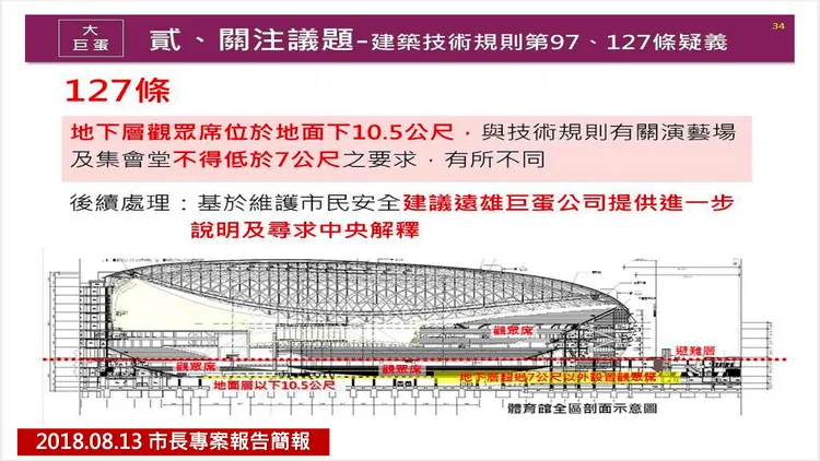 簡舒培進一步指,根據建築技術規則第127條,若要做演唱會使用,觀眾席不得設在地下7公尺以下,而大巨蛋最底層是地下10.5公尺,柯文哲在2018年8月13日的專案報告也講說兩者有所不同,然至今都尚未說明。