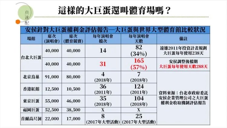 此外,台北市政府更在第三次建造變更時,說遠雄只要以大型群聚活動安全管理自治條例,一次次申請就好,因為柯認為大巨蛋是體育館,不是演唱會館,這是臨時使用,但從安侯會計公司提出的報告顯示,大巨蛋未來有近6成的時間都在開演唱會,比例甚至超過日本東京巨蛋、韓國高尺洞等知名大型場館。