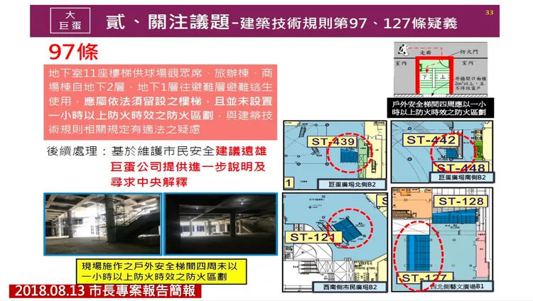 簡舒培指出,柯文哲在2018年8月13日的專案報告顯示,建築技術規則第97條,針對避難層的疑義,「大巨蛋11座地下樓梯供觀眾席、旅辦棟、商場棟自地下2層、地下1層往避難層避難逃生使用,應屬依法須留設之樓梯,且並未設置一小時以上防火時效之防火區劃」,請遠雄巨蛋公司提出說明。