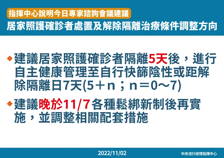 指揮官王必勝宣布,自11/14起,居家照護確診者隔離天數縮短為5+n,隔離完五天後若立即快篩陰性就不用自主健康管理,如果一直無法快篩陰性,就得自主健康管理7天後才自動解除。