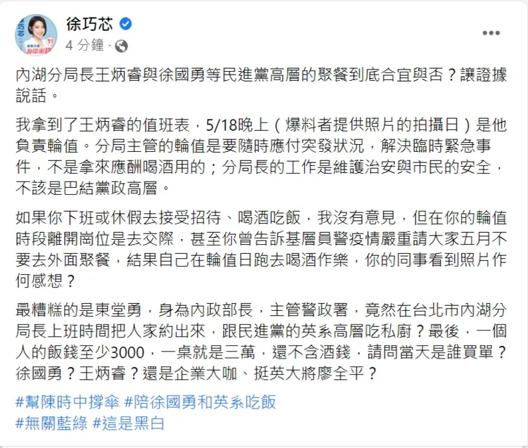 徐巧芯還說,如果你下班或休假去接受招待、喝酒吃飯,她沒有意見,但在你的輪值時段離開崗位是去交際,甚至你曾告訴基層員警疫情嚴重請大家五月不要去外面聚餐,結果自己在輪值日跑去喝酒作樂,你的同事看到照片作何感想?