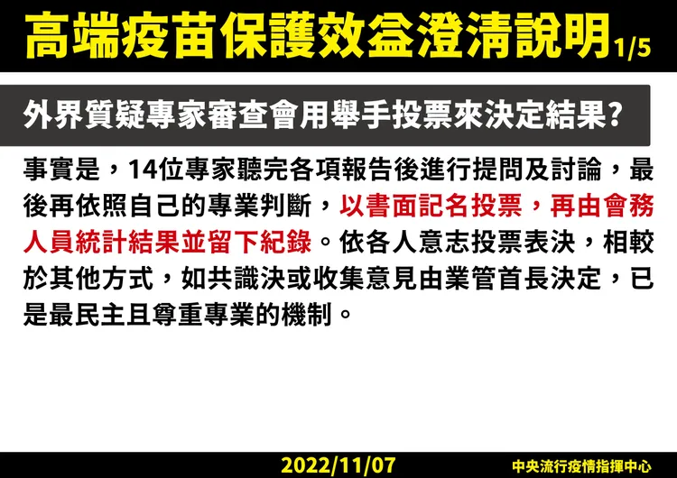 媒體詢問,去年高端緊急授權審核中,有一位專家投下不同意票,今年則全票通過,這兩次投票結果不同原因為何?指揮中心是否將該位反對專家撤換掉?王必勝回應,去年審EUA的專家,跟今年專家未必是一樣的,在專家人才庫中、當天能來才會參與投票,專家在會議中的意願也會忠實記錄下來。