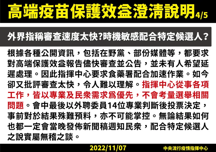 年底選舉倒數不到3周,現外界針對高端疫苗保護效益審查卻認為速度太快,指時機敏感是要配合特定候選人。對此,王必勝表示,過去無論在野黨或部分媒體,都希望高端保護效益報告能盡快審查公告,以各種言詞希望加快,「大家可以去查,有沒有任何一篇希望要慢慢弄?說不急?」