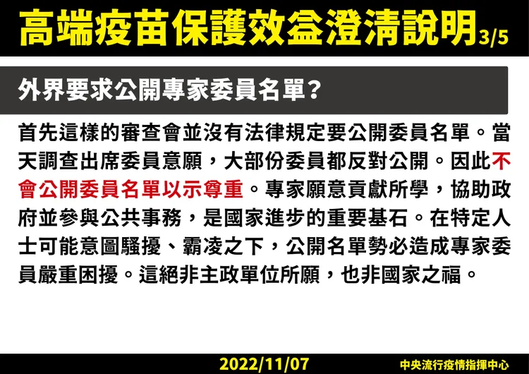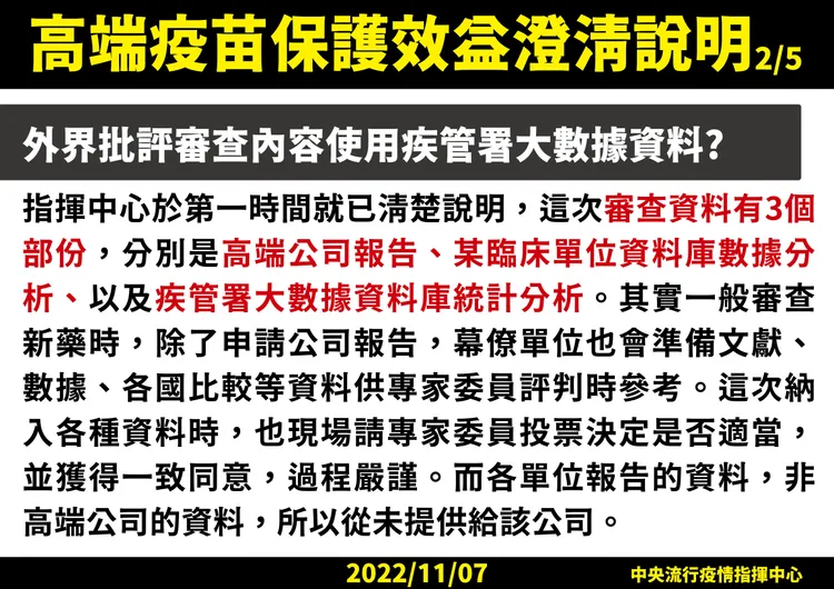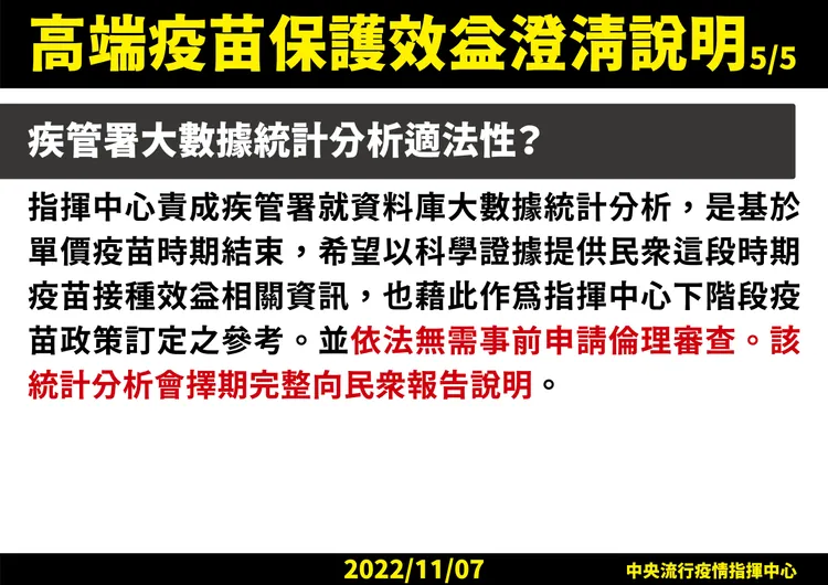 針對高端疫苗保護效益,王必勝也提到,疾管署透過大數據統計分析,主要是因10月已開打次世代疫苗;面對單價疫苗時代結束,王必勝說,希望以科學數據,提供民眾這段時間疫苗接種效益資訊,也作為指揮中心下階段疫苗政策訂定參考。