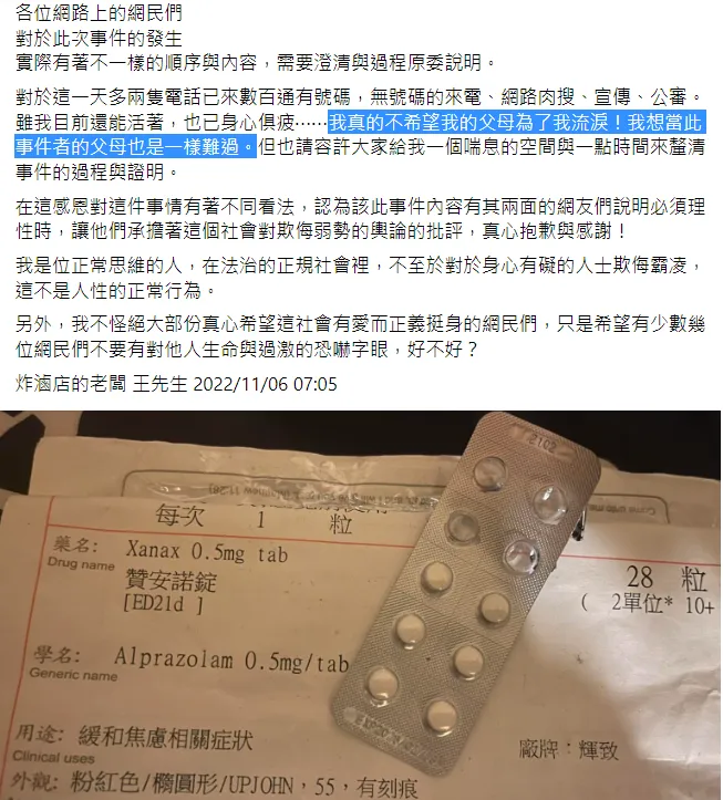 炸物店老闆昨天委託朋友在臉書「爆料公社」代為發聲明指稱該事件「實際有著不一樣的順序與內容,需要澄清與過程原委說明。」但也未再交代事件經過,哭訴2隻電話近來已有數百通來電、遭肉搜及公審等,「雖我目前還能活著,也已身心俱疲⋯⋯我真的不希望我的父母為了我流淚!」貼出藥袋及藥物的照片,他的友人說,「王先生目前精神狀況非常不佳 在事後這2天已無進食及睡眠 早上8點左右已服用精神鎮定劑了」。