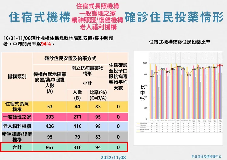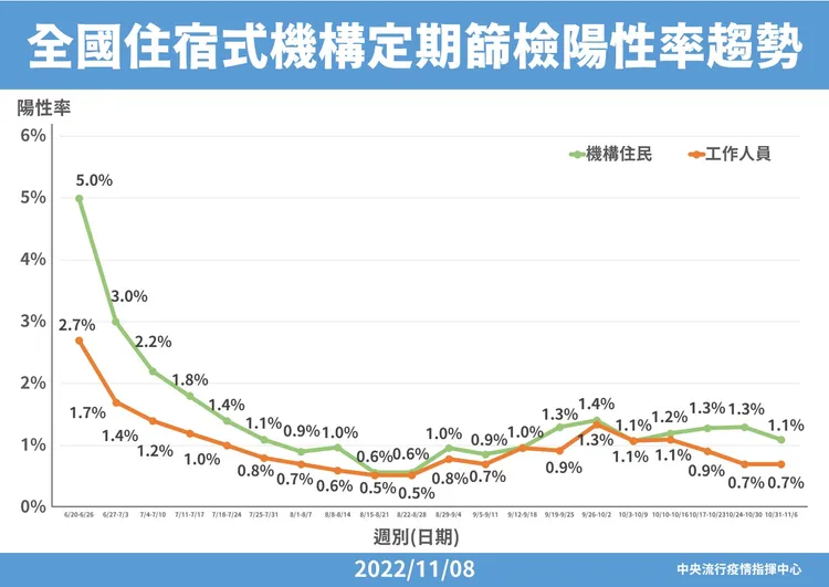 針對住宿式機構陽性率,羅一鈞則說,住民陽性率為1.1%,較上周1.3%下降,是10月以來首度出現反轉,與疫情脫離高原期有關,會持續觀察趨勢,評估篩檢頻率是否需要調整;工作人員則與上周持平、維持在0.7%,機構住民投藥率整體為94%。