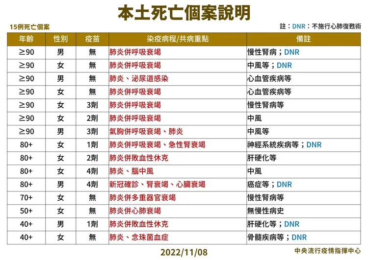 對於死亡個案,指揮中心指出,今日新增15例本土病例死亡個案,為5例男性、10例女性,年齡介於40多歲至90多歲以上,皆屬重度感染、14例具慢性病史、11例未接種3劑以上COVID-19疫苗。確診日介於今(2022)年9月13日至11月4日,死亡日期介於10月28日至11月5日。