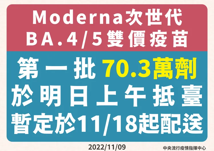 中央流行疫情指揮中心今(9)日表示,今年採購之第一批Moderna次世代 BA.4/5雙價疫苗70.3萬劑,於明日上午抵達桃園國際機場,完成通關程序後,直接運送至指定冷儲物流中心進行後續檢驗封緘作業,暫定於11月18日起提供12歲以上民眾接種追加劑使用。本批效期至2023年6月27日。