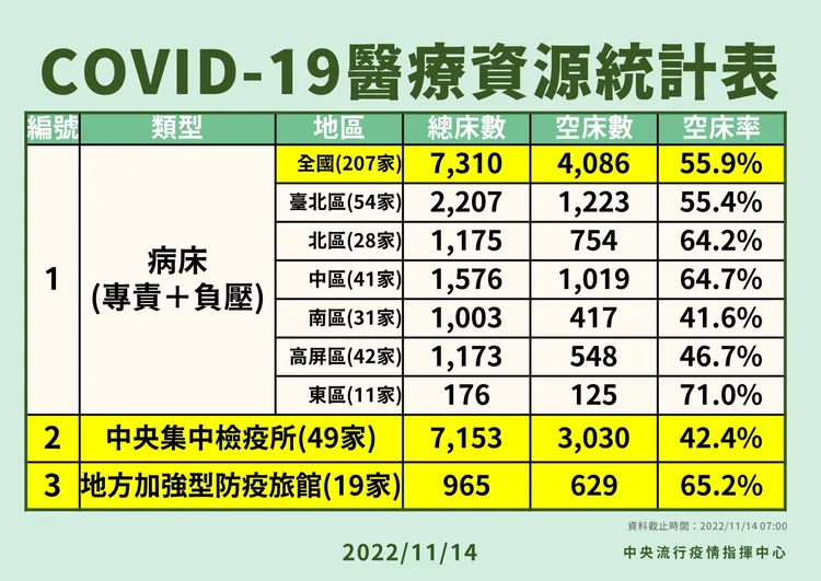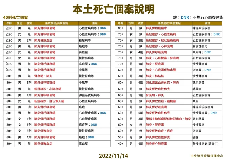 指揮中心指出,今日新增40例本土病例死亡個案,為29例男性、11例女性,年齡介於40多歲至90多歲以上,皆屬重度感染、39例具慢性病史、28例未接種3劑以上COVID-19疫苗。確診日介於今(2022)年9月14日至11月10日,死亡日期介於10月13日至11月11日。