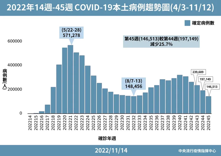 指揮官王必勝說明,第45周確診人數為146513例、比前一周的197149例減少25.7%,已經比8/7疫情剛開始上升當週還要更低,可以判斷BA.5疫情已經結束,但可以觀察一到兩周,單周14萬餘人也是4月底、第17周以來,確診人數最低的一周,疫情趨緩絕對沒有錯,會繼續觀察疫情是下降還是持平。