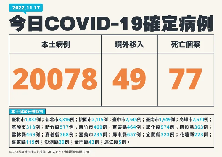 對於死亡個案,指揮中心指出,今日新增77例本土病例死亡個案,為46例男性、31例女性,年齡介於40多歲至90多歲以上,皆屬重度感染、76例具慢性病史、58例未接種3劑以上COVID-19疫苗。確診日介於今(2022)年10月7日至11月14日,死亡日期介於10月25日至11月14日,詳如新聞稿附件。