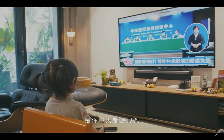 後續的畫面是,1個孩子在看陳時中擔任中央流行疫情指揮中心指揮官時、主持防疫記者會的畫面,搭配旁白說,「或者是你每天都會見到、沒有任何一天休息、溫暖地回應每個尖銳問題的?」由於過去下午2時,全民皆會準時收看疫情記者會,競辦規劃在今天同一時間起在電視上釋出此影片,但受限於經費,電視上只會播出30秒版本,完整版已可在YouTube上觀看。