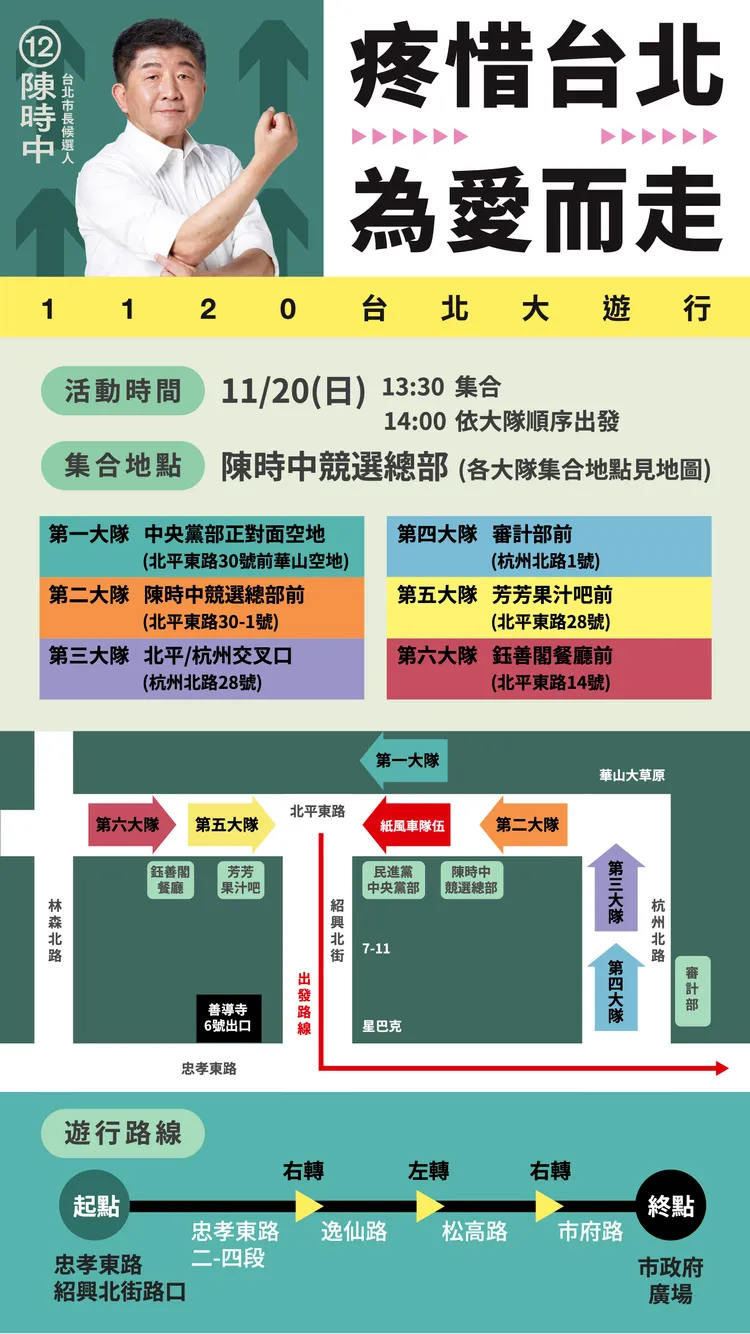 陳時中團隊規劃的大遊行,於今天下午1時30分起,在競選總部附近的北平東路與紹興北街口集結,隨後於下午2時至2時20分,由陳時中致詞,隨後紙風車花車劇團與6大隊遊行隊伍陸續出發,而陳時中則會待大隊出發後跟上,並與支持者一起步行前往台北市政府前廣場。