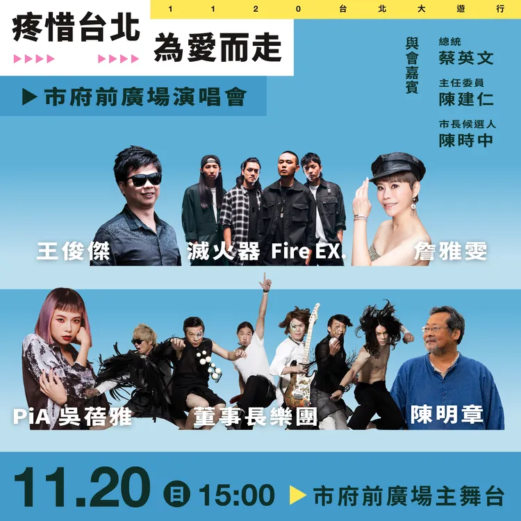 下午3時走到市府後,將由董事長樂團、金曲歌王王俊傑、民謠大師陳明章、創作歌手Pia 吳蓓雅、金曲歌后詹雅雯與滅火器樂團等替陳時中寫歌的音樂人,帶來一連串表演,下午5時起則陸續由擔任陳時中競總主委的前副總統陳建仁、總統兼民進黨主席蔡英文與陳時中發表談話。